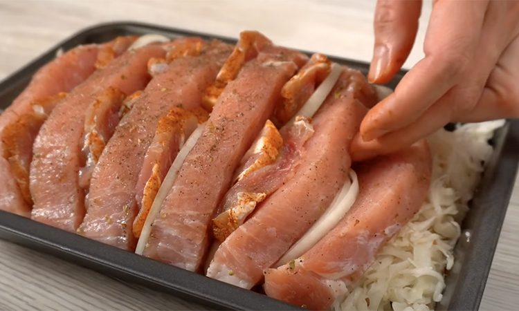 2. Смажьте дно и стенки формы растительным маслом, чтобы мясо не прилипло и получилась золотистая корочка. При желании выложите первым слоем квашеную капусту – она будет отдавать сок мясу и создавать готовый гарнир.