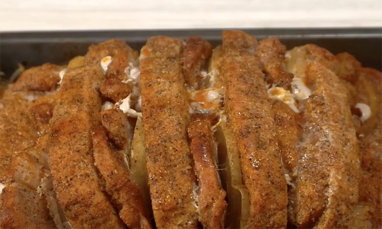 3. В прорези мяса вставьте колечки лука. Лук даст сладковатый аромат и сок, который пропитает мясо. Между луковыми колечками разместите кусочки сала – оно растает при запекании, добавляя сок и мягкость.