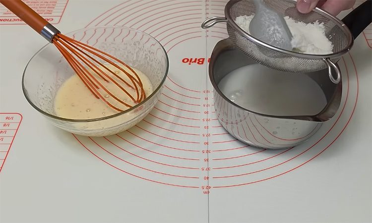 Приготовьте заварную основу: смешайте молоко с кокосовой стружкой, доведите до кипения и проварите полминуты. Процедите молоко через сито, хорошо отжав стружку (саму стружку не выбрасывайте, она пойдет в крем). Смешайте сахар с просеянным крахмалом и одним яйцом до гладкости, влейте туда ароматное молоко и варите на небольшом огне до загустения.