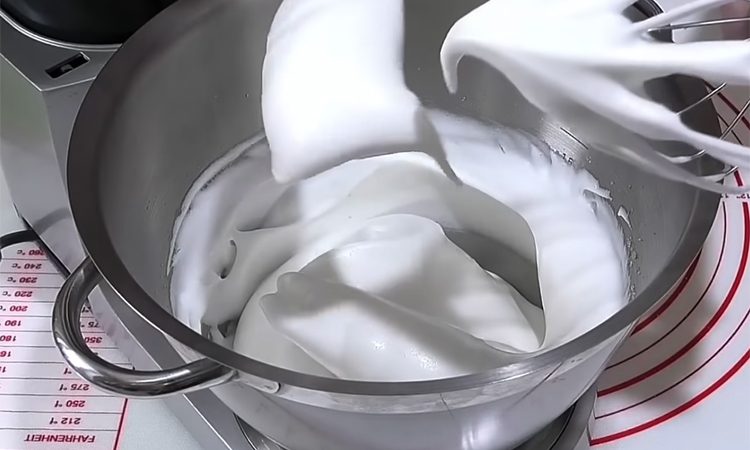 После появления первых пузырьков кипения проварите массу одну минуту, снимите с огня, верните в нее отжатую стружку, добавьте ванильный сахар и оставьте остывать под пленкой «в контакт». Для бисквита взбейте белки с солью до пышности, постепенно всыпая сахар до получения плотных пиков, затем аккуратно вмешайте желтки и просеянную муку.