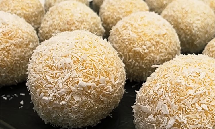 Сформируйте из полученного теста небольшие шарики, обваляйте их в кокосовой стружке и уберите в холодильник, но перед подачей обязательно дайте им согреться до комнатной температуры.