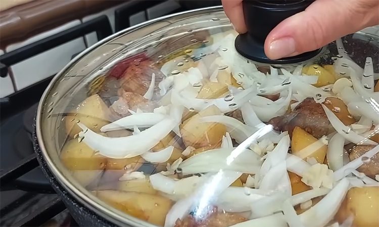 Добавьте подготовленный картофель к мясу, накройте сковороду крышкой и продолжайте жарить, периодически аккуратно переворачивая кусочки для равномерного цвета. Лук нарежьте крупными лепестками, а чеснок просто раздавите плоской стороной ножа.