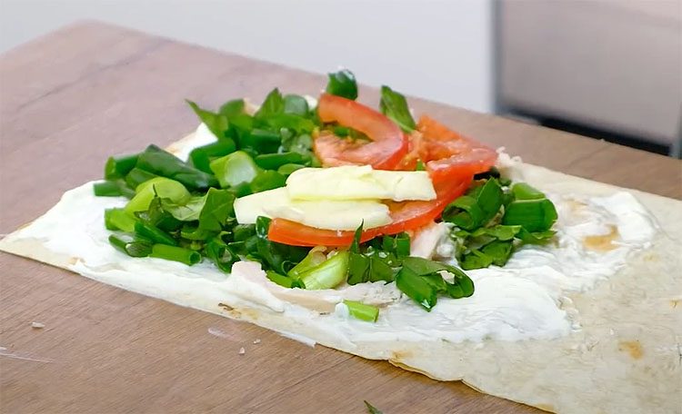 3. Лист лаваша положить на рабочую поверхность. Разрезать его на полоски шириной примерно 14 см (ширина может варьироваться в зависимости от размера лаваша и желаемого размера пирожков). На каждый кусок лаваша равномерно распределить соус, сверху выложить слой начинки: сначала куриное филе, зелень, помидоры и сыр.