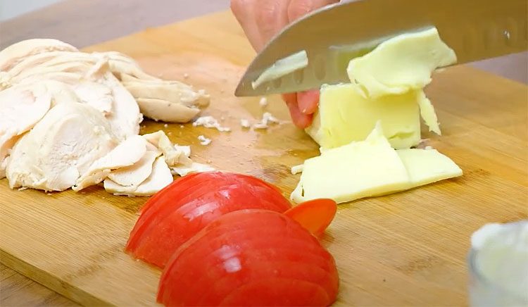 1. Отварное куриное филе нарезать тонкими слайсами или небольшими полосками — так начинка будет мягкой и хорошо распределится внутри пирожка. Сыр нарезать тонкими ломтиками. Помидор нарезать тонкими кружочками или небольшими ломтиками, чтобы сок не вытекал сильно. Если помидор очень сочный, можно слегка промокнуть его бумажным полотенцем. Зеленый лук и базилик мелко измельчить ножом — ароматная зелень придаст свежесть и яркий вкус. Чеснок очистить и мелко порезать или выдавить через пресс.