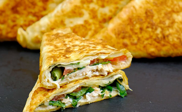 4. Аккуратно свернуть лаваш с начинкой в треугольники. Для этого сложите нижний угол полоски с начинкой, поднимая и загибая к противоположной стороне, формируя треугольник, и так далее, пока не свернете весь лаваш. В миске взбить яйца с молоком до однородной массы. Можно добавить щепотку соли и перца для вкуса. Каждый треугольник обмакнуть в яично-молочную смесь со всех сторон, чтобы тесто хорошо пропиталось и при жарке получилась хрустящая корочка.