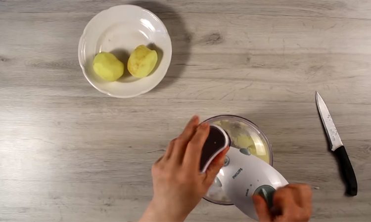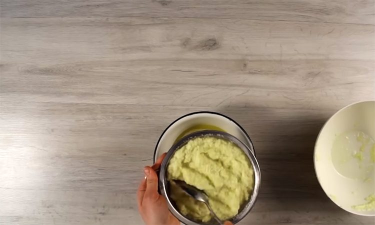Натрите лук на самой мелкой терке, чтобы получилась однородная кашица. Очищенный картофель также натрите на мелкой терке или измельчите в комбайне с соответствующей насадкой, сразу перемешивая его с луком для сохранения светлого цвета. Откиньте получившуюся массу на сито на пару минут, чтобы стекла лишняя влага, так как это позволит жарить драники без добавления муки.