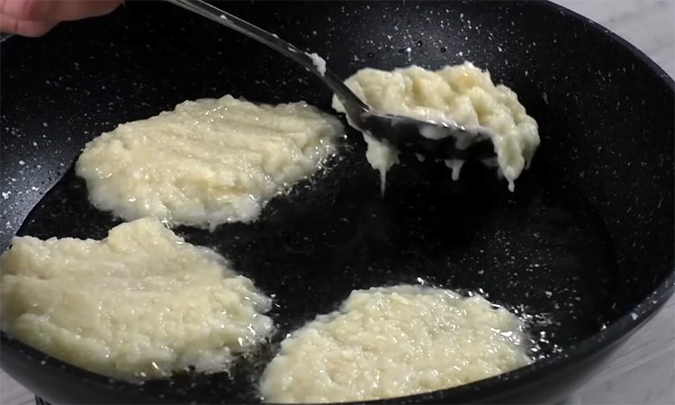 Картофельный сок не выливайте сразу, а дайте ему постоять, затем слейте воду и верните осевший на дно крахмал обратно в картофельную массу. Добавьте в миску соль, одну-две ложки растительного масла для лучшей прожарки внутри и тщательно перемешайте все ингредиенты. Хорошо разогрейте сковороду с достаточным количеством масла и выкладывайте картофельную смесь столовой ложкой, формируя оладьи средней толщины.