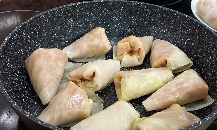 Каждый сформированный голубец быстро обжарьте на масле до румяной корочки и плотно уложите в глубокую форму для запекания. Перекладывайте слои голубцов готовой овощной заправкой, добавьте лавровый лист и влейте немного воды, в которой варилась капуста.