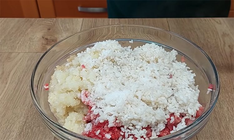 Отварите рис в кипящей воде ровно пять минут до полуготовности и откиньте его на сито. Одну крупную луковицу нарежьте кубиками и обжарьте на масле с солью и сахаром до мягкости, после чего соедините ее с мясным фаршем и остывшим рисом. Для дополнительной сочности добавьте в начинку еще одну небольшую луковицу, измельченную через мясорубку, всыпьте соль, перец, куркуму, паприку и сушеный чеснок.