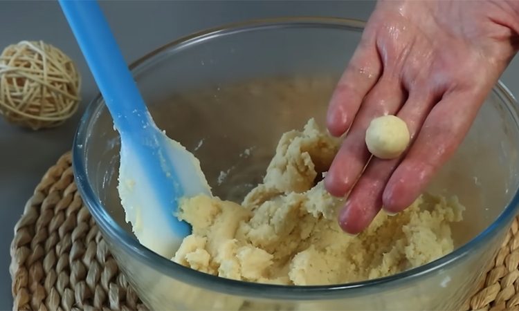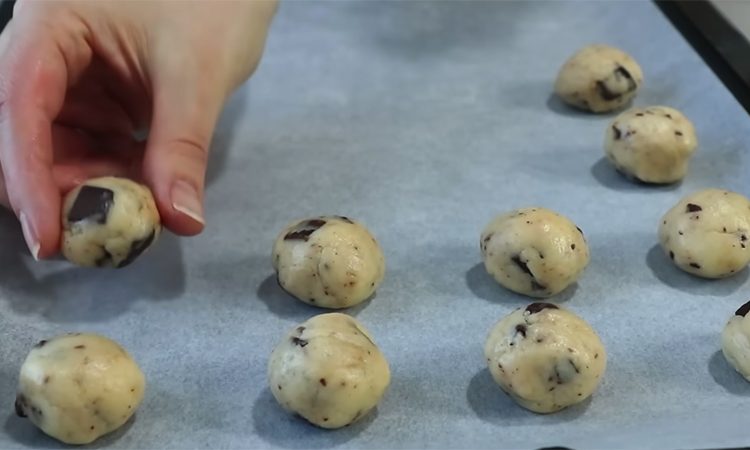 Нарежьте шоколад на небольшие кусочки ножом и вмешайте его в готовое тесто для равномерного распределения. Отщипывайте от теста небольшие кусочки весом около 10–15 грамм и скатывайте их в ровные аккуратные шарики.