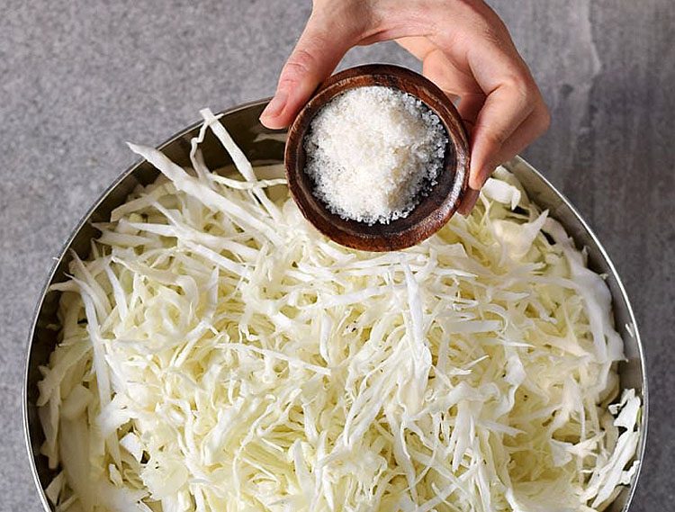 Примечание: важно, чтобы соли не было слишком много, иначе процесс брожения замедлится. Оптимальная пропорция — 20–25 г соли на 1 кг капусты.