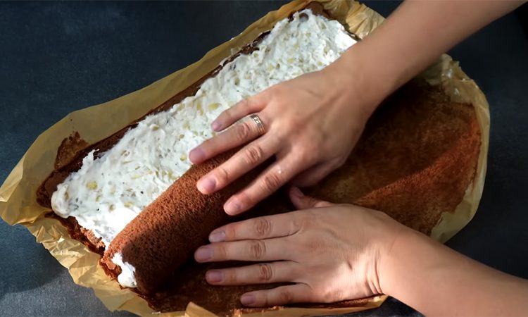 Отложите несколько ложек крема для украшения, а в остальную массу добавьте нарезанные кубиками бананы. Разверните остывший бисквит, равномерно распределите по нему сливочно-банановую начинку и снова сверните его.