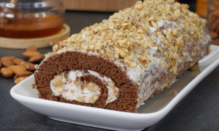 Смажьте поверхность рулета оставленным кремом, посыпьте измельченными грецкими орехами и уберите в холодильник на четыре часа для стабилизации.