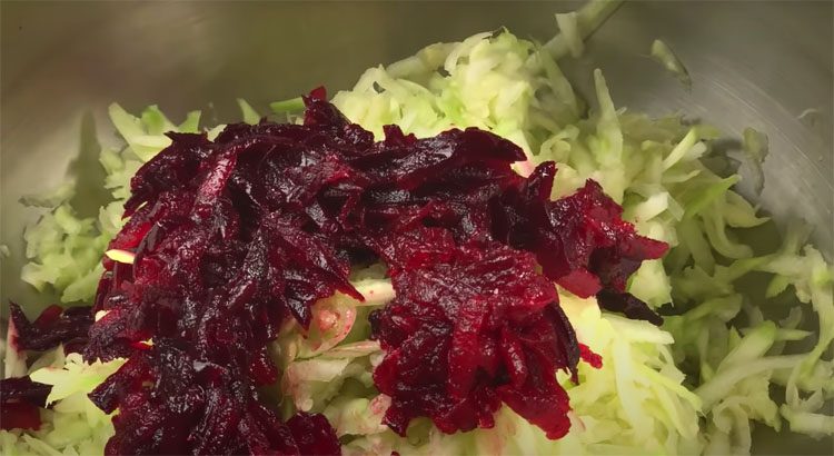 1. Вымойте свеклу, срежьте хвостики и отварите до готовности (примерно 40–60 минут). Дайте полностью остыть, очистите и натрите на крупной терке. Вымойте кабачок, при необходимости очистите от кожицы, натрите на крупной терке и слегка отожмите сок, если овощ очень сочный.