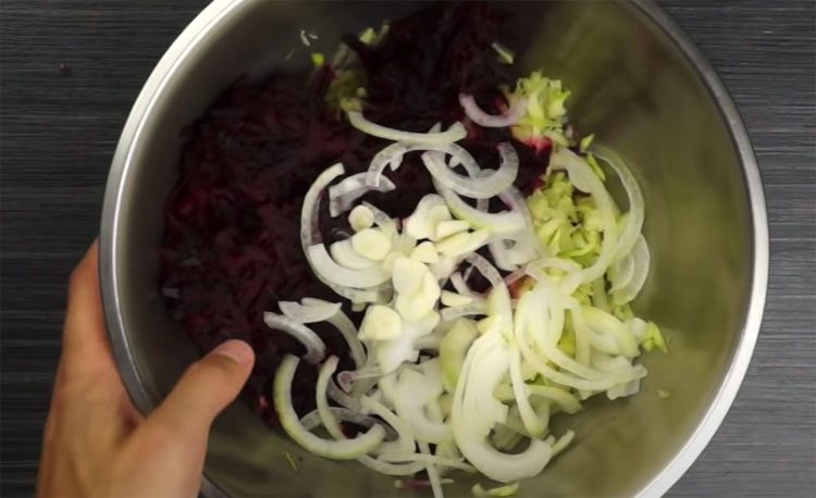3. В большой миске соедините свеклу, кабачок, лук и чеснок. Тщательно перемешайте, чтобы овощи распределились равномерно.