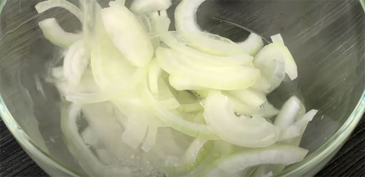 2. Очистите лук и нарежьте полукольцами или кубиками, залейте кипятком на 1–2 минуты, затем откиньте на сито, чтобы убрать горечь. Очистите чеснок и мелко нарежьте или пропустите через пресс.