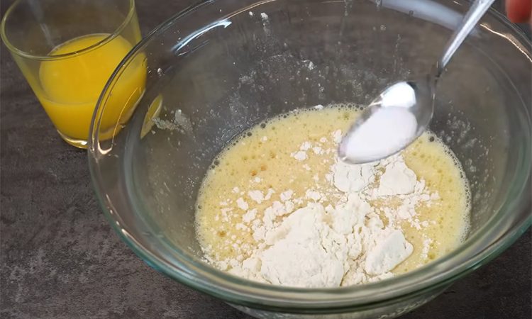 Разровняйте тесто по дну и отправьте в разогретую до ста восьмидесяти градусов духовку на пятнадцать минут, пока края не начнут слегка золотиться. Для второго слоя взбейте венчиком три яйца с сахаром, введите столовую ложку муки, соду и влейте подготовленный апельсиновый сок.