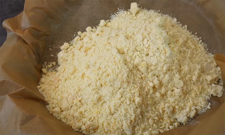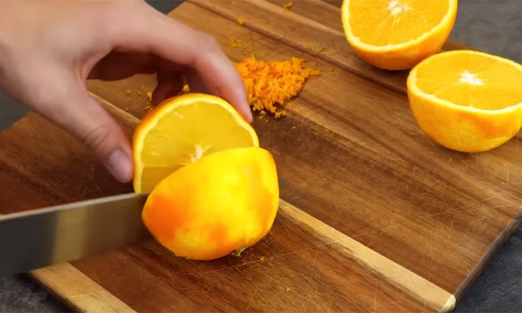Снимите с двух апельсинов столовую ложку цедры и выжав сто миллилитров свежего сока. Соедините мягкое сливочное масло с цедрой, добавьте сахарную пудру и тщательно перемешайте до однородности. Всыпьте муку и разотрите массу руками до состояния мелкой крошки, после чего выложите ее в форму диаметром двадцать шесть сантиметров, предварительно застеленную бумагой.