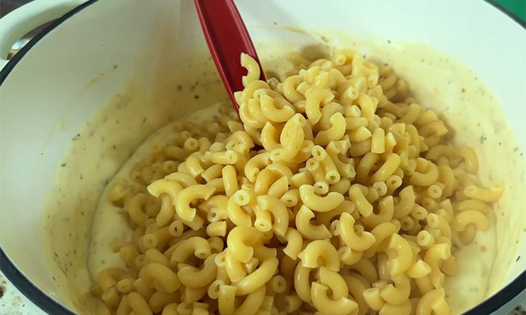 Начните вливать холодное молоко небольшими порциями, продолжая активно мешать массу, чтобы в соусе не появились комочки. Добавьте в кастрюлю сушеные травы, горчицу и черный перец, после чего варите соус на слабом огне до небольшого загустения. Параллельно отварите макароны в подсоленной воде до состояния легкой недоваренности, ориентируясь на время на упаковке.