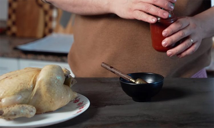 Достаньте птицу из бульона и тщательно обсушите её бумажными полотенцами, чтобы кожа стала сухой — это важно для прилипания соуса. Для намазки смешайте в миске аджику, пропущенный через пресс чеснок и немного растительного масла до однородной густой консистенции.