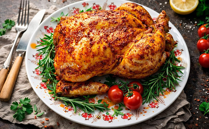 Тщательно натрите курицу полученной смесью снаружи и внутри, распределяя соус равномерным слоем. Поместите курицу в разогретую до 220 градусов духовку на 10 минут, затем убавьте температуру до 180 градусов и запекайте еще 25 минут. Каждые 10 минут доставайте противень и поливайте тушку вытопившимся жиром для получения идеальной корочки.
