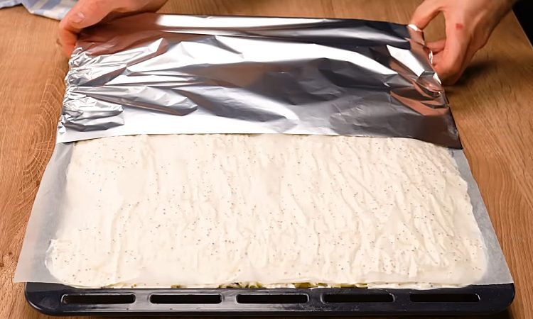 5. Накройте противень сначала пергаментной бумагой, а затем фольгой, плотно закрепив края. Поставьте форму в духовку, разогретую до 180 °C, и запекайте около 45 минут, пока картофель не станет мягким, а мясо — сочным. Затем снимите фольгу и пергамент и продолжайте запекать ещё 7–8 минут, чтобы сыр полностью расплавился и подрумянился до золотистой корочки.