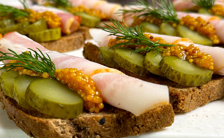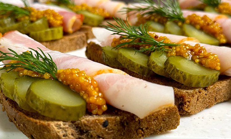 Нанесите тонкую полоску зернистой горчицы на границу между мясом и овощами. Украсьте каждый бутерброд небольшой веточкой свежего укропа и сразу подавайте к столу.