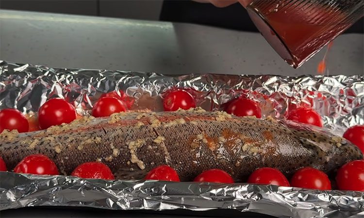 Сделайте на одном боку рыбы пять поперечных надрезов, стараясь не прорезать хребет, и аккуратно переложите ее в подготовленную лодочку из фольги. Разложите вокруг рыбы свежие помидоры, нарезанные крупными дольками, и осторожно влейте на дно формы томатный сок, следя за тем, чтобы он не смыл маринад с самой тушки.