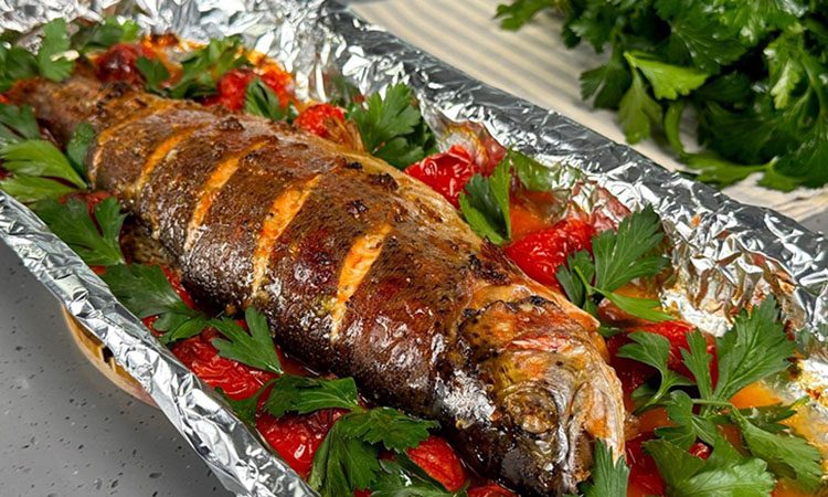 Рыба по-астрахански — это запеченная рыба целиком с помидорами и минимальным набором специй. Блюдо не требует сложной подготовки и подходит для разных сортов рыбы, что делает его универсальным. Небольшая маринация перед запеканием усиливает вкус, а томатный сок добавляет сочность.