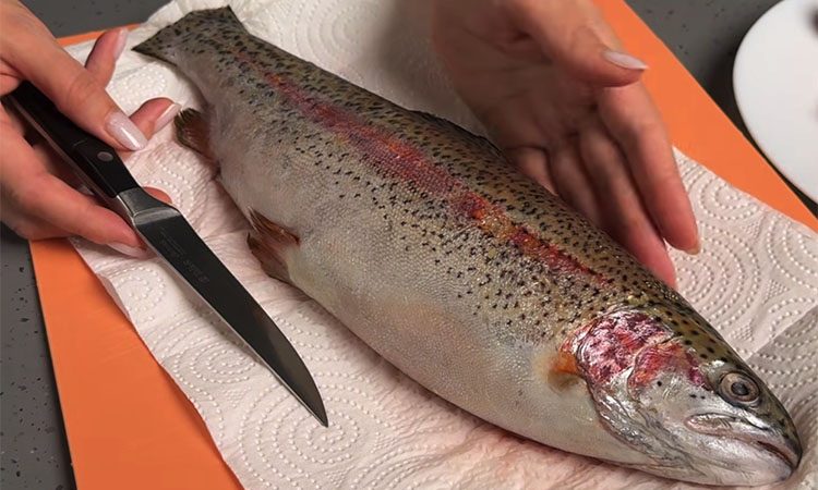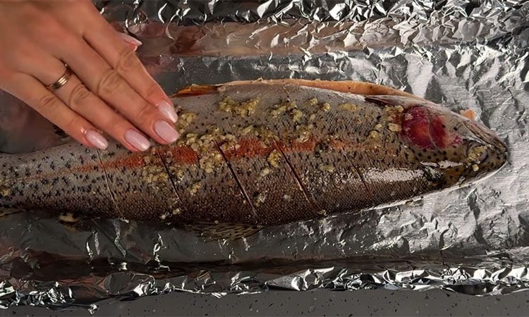 Полученной ароматной смесью щедро натрите рыбу снаружи, внутри и даже под головой, а затем обильно сбрызните ее соком половины лимона. Оставьте рыбу мариноваться при комнатной температуре примерно на пятнадцать минут, чтобы специи успели проникнуть в волокна мяса. Возьмите противень и застелите его двумя слоями прочной фольги, после чего сформируйте из нее высокие плотные бортики и слегка смажьте дно небольшим количеством масла.