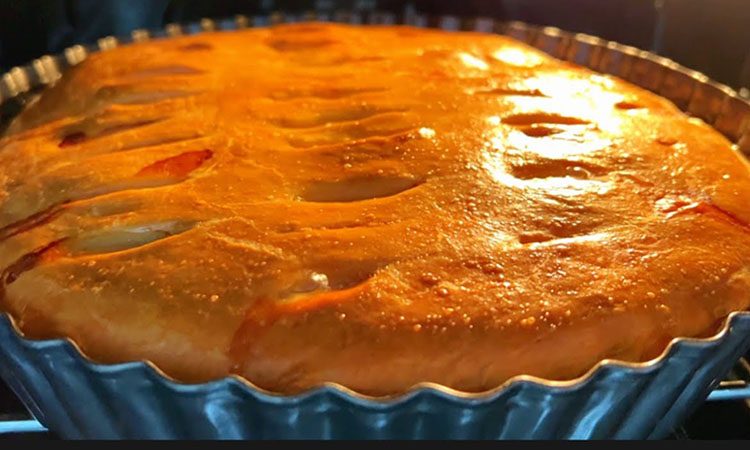 Выпекайте пирог в разогретой до ста восьмидесяти градусов духовке около пятидесяти или шестидесяти минут до золотистого цвета.