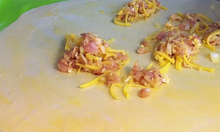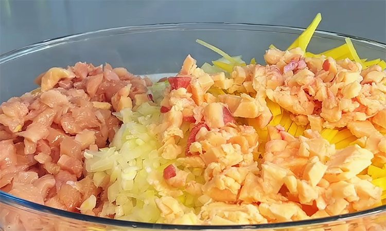 Просейте муку в миску, сделайте углубление и влейте воду комнатной температуры, добавив соль и растительное масло. Замесите мягкое тесто, соберите его в комок и дайте отдохнуть пять минут, после чего вымесите до полной гладкости и разделите на две равные части. Пока тесто отдыхает под пленкой, подготовьте начинку: нарежьте курицу и говяжий жир мелким кубиком, лук нашинкуйте мелко, а картофель нарежьте очень тонкой соломкой.