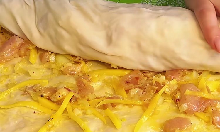 Сверните тесто с начинкой в плотный рулет, а затем закрутите его в форме улитки, спрятав хвостик под низ. Переложите заготовку на противень с пергаментом, немного придавите рукой для придания плоской формы и смажьте взболтанным яйцом.