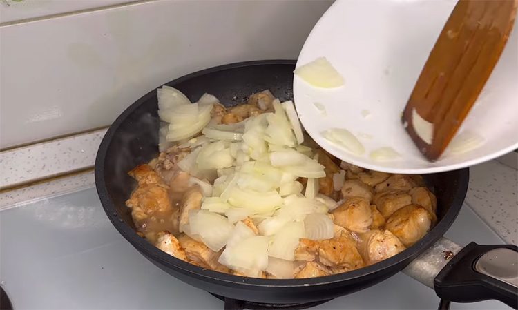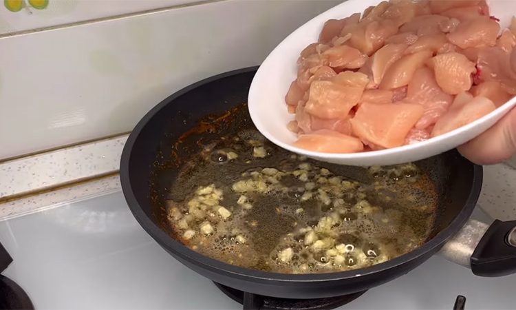 Нарежьте куриное филе небольшими кусочками, выложите к чесноку и обжаривайте на среднем огне до золотистой корочки, посолите и поперчите. Добавьте нарезанный лук и готовьте вместе несколько минут до его мягкости.