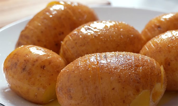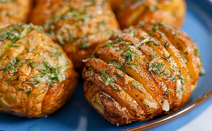 Если картошка запекается целиком без подготовки, она долго готовится и не всегда равномерно пропекается внутри, поэтому в этом рецепте используется двухэтапная технология. Сначала клубни надрезаются и недолго отвариваются, что позволяет добиться мягкой текстуры и ускорить запекание, а затем отправляются в духовку при высокой температуре до румяной корочки. Главный акцент делается на соусе из запеченного чеснока, сливочного масла и свежей зелени, который наносится уже на горячий картофель и заполняет каждый разрез, превращая привычный гарнир в по-настоящему вкусное блюдо.