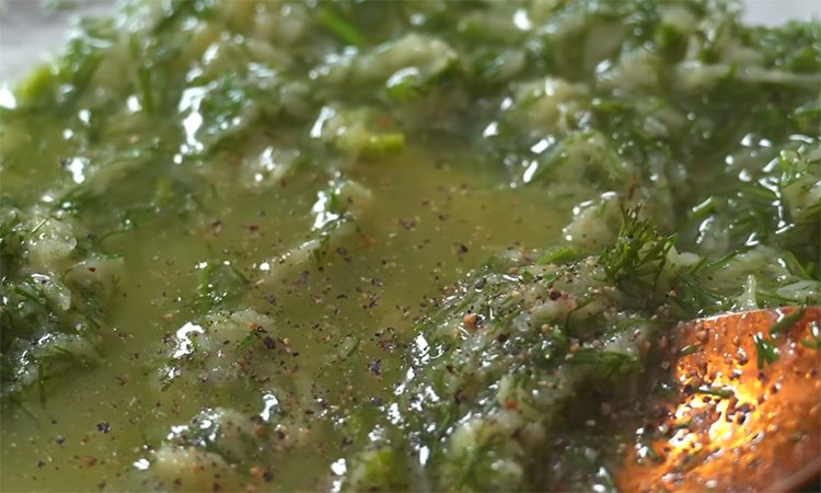 Переложите чесночную массу в миску, добавьте растопленное сливочное масло, нашинкуйте сюда же зелень, слегка подсолите и добавьте свежемолотый черный перец. Перемешайте до однородной ароматной смеси.