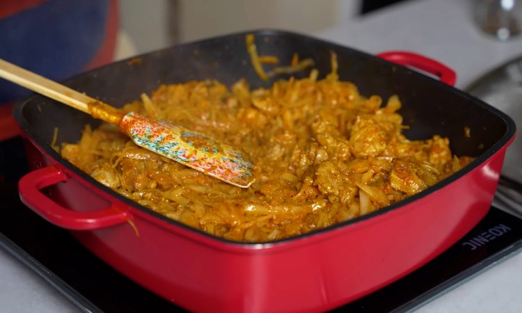 4. Через 10 минут аккуратно перемешайте содержимое сковороды. Добавьте чайную ложку соли и две столовые ложки томатной пасты. Хорошо вымешайте капусту, мясо и овощи, чтобы паста равномерно покрыла все ингредиенты. На этом этапе блюдо начинает приобретать насыщенный цвет и аромат, а специи раскрываются, придавая характерный восточный вкус. Готовьте еще 5 минут. На этом этапе аромат становится ярким и насыщенным, а капуста мягкой и сочной.