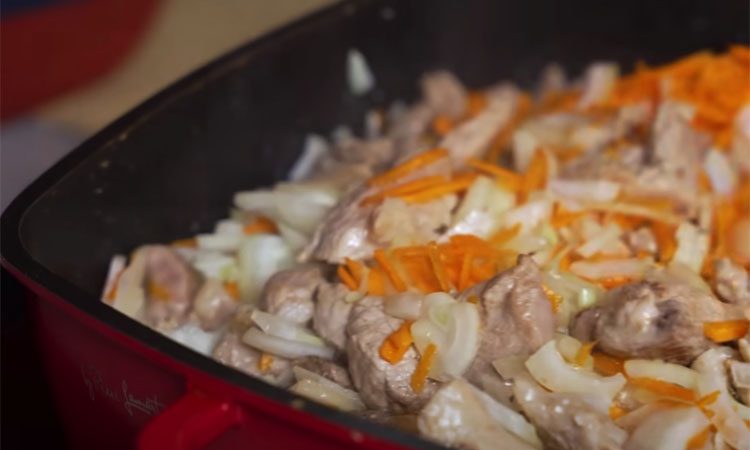 2. Луковицу очистите и нарежьте крупными дольками, морковь промойте, очистите и натрите на крупной терке. Когда мясо слегка подрумянится, добавьте к нему лук и морковь. Обжаривайте всё вместе на сильном огне 5–7 минут, периодически помешивая, чтобы овощи раскрыли сладость и аромат, а мясо вобрало в себя соки. Важно не убавлять температуру слишком рано — это поможет овощам быстрее смягчиться и насытить мясо ароматом.