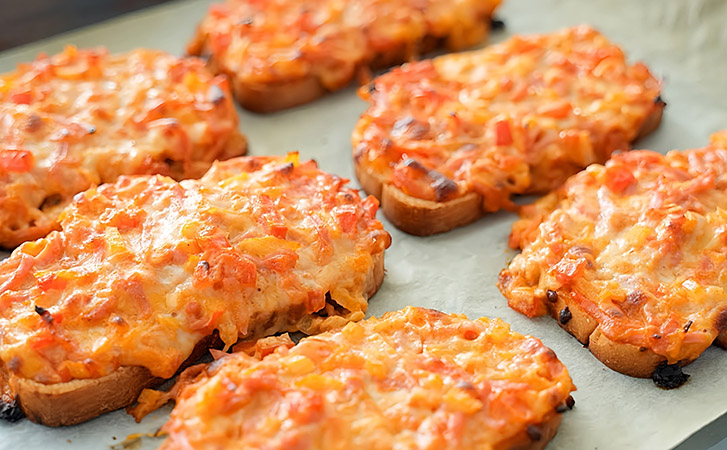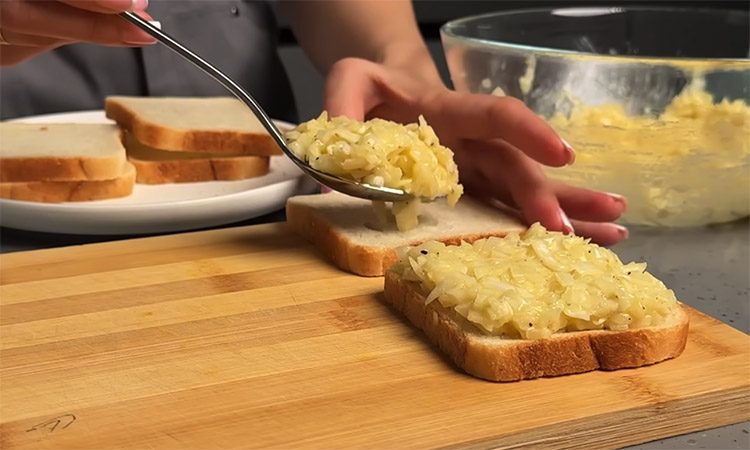 Соедините нарезанный лук с яичной смесью, посолите и поперчите по вкусу, после чего хорошо вымешайте массу. Нарежьте хлеб или батон на ломтики средней толщины, если используете не порезанный заранее продукт. Обильно намажьте луковую смесь на одну сторону каждого кусочка хлеба, слегка прижимая начинку.