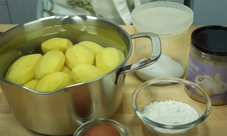 Очистите картофель от кожуры и отварите в несоленой воде до полной готовности. Слейте воду через дуршлаг, дайте лишней влаге полностью испариться, затем разомните картофель толкушкой в однородное пюре. Посолите остывшее пюре по вкусу, добавьте специи, разбейте в него яйцо и перемешайте. Всыпьте немного муки и замесите ложкой густое и пластичное тесто, которое должно слегка липнуть к рукам.