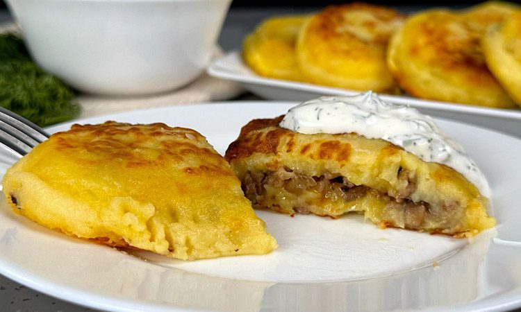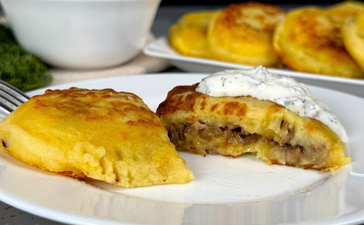 Подавайте готовое блюдо горячим вместе со сметаной, чтобы полностью раскрыть вкус нежного картофеля и мясной начинки.