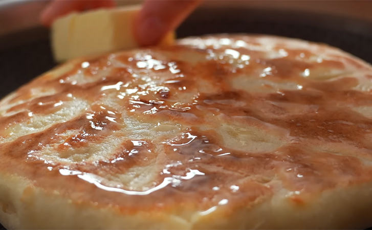 Раскатайте получившийся мешочек скалкой в плоскую лепешку по диаметру вашей сковороды, действуя плавно, чтобы не порвать тесто. Выложите хачапури на сухую разогретую сковороду и обжаривайте на среднем или медленном огне примерно по пять минут с каждой стороны. Готовую горячую лепешку сразу переложите на тарелку и обильно смажьте сливочным маслом, пока она еще выделяет пар.