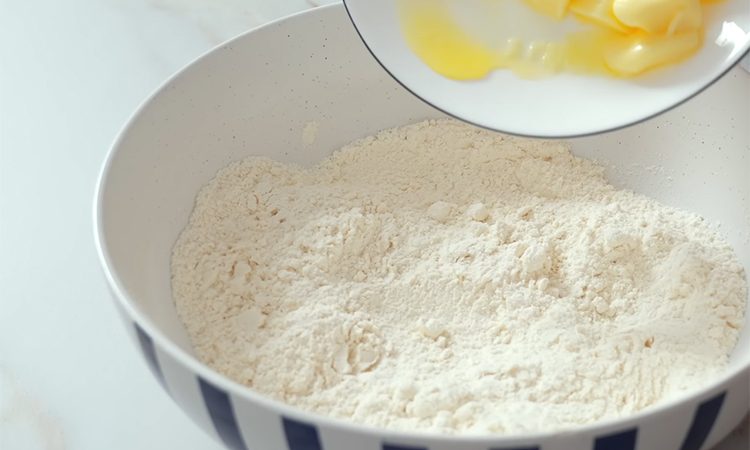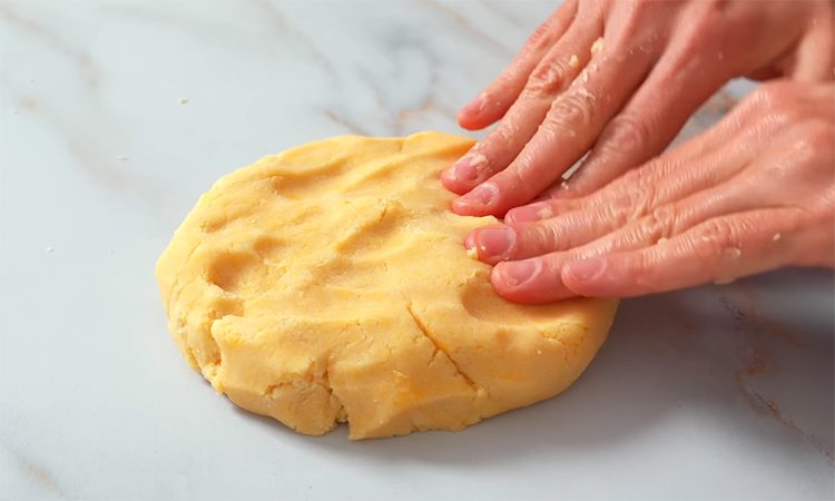 Начните с подготовки сухих компонентов, соединив в глубокой емкости муку, разрыхлитель, соль, обычный и ванильный сахар. Тщательно перемешайте смесь лопаткой и добавьте мягкое сливочное масло, а также два яичных желтка, предварительно отделив белки в чистую сухую посуду. Замешивайте тесто сначала лопаткой, а затем быстро соберите его руками в единый шар на рабочей поверхности, стараясь не перегревать массу теплом рук.
