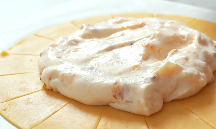 Оставшиеся обрезки теста соберите и уберите в морозильную камеру. Переложите основу на пергамент, распределите белковую начинку по центру, не доходя до разрезов, и аккуратно поднимите края теста, формируя декоративный бортик.