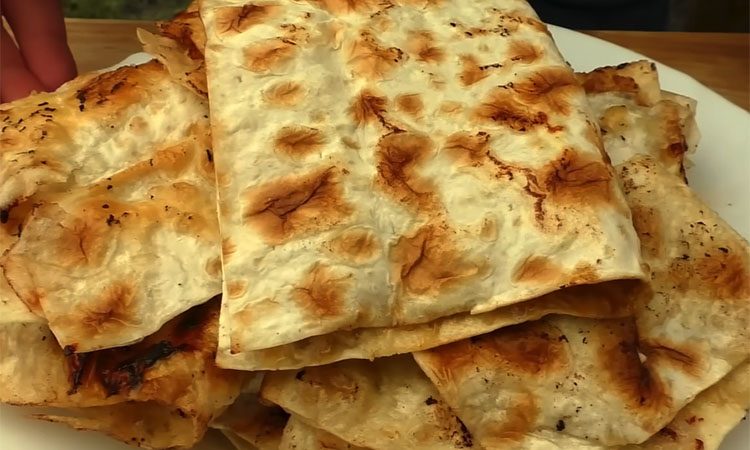 Сложите лаваш пополам, прижав края лопаткой, и прогрейте еще несколько секунд с каждой стороны до расплавления сыра.