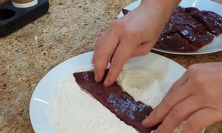 Обмакните каждый кусочек печени сначала в мучную смесь со всех сторон, а затем в яичную массу.