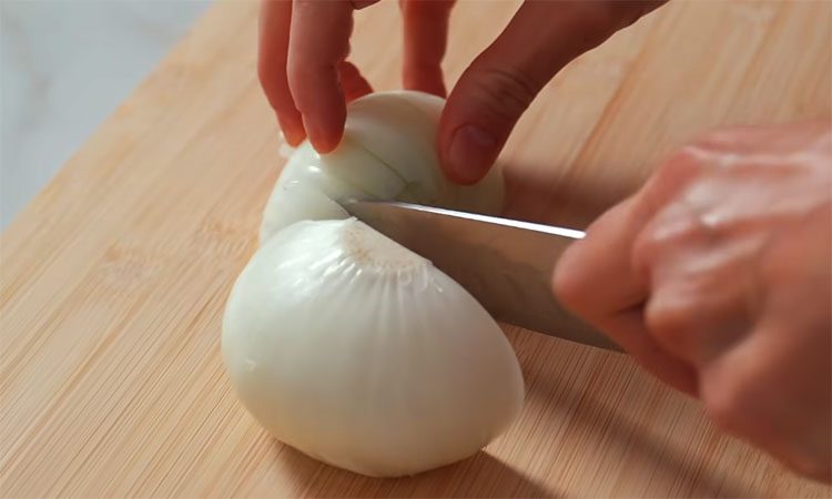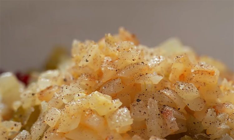 Нарежьте лук мелкими кубиками и отправьте на разогретую сковороду с оливковым маслом. Обжаривайте лук на среднем огне до тех пор, пока он не станет прозрачным и не приобретет легкий золотистый оттенок. Пока лук готовится, очистите заранее отваренную свеклу от кожицы и нарежьте её небольшими аккуратными кубиками.