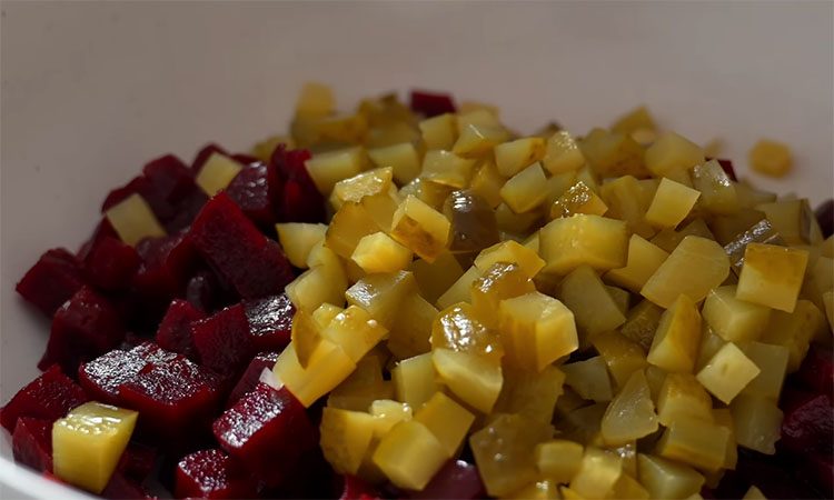 Маринованные огурцы также нарежьте кубиками аналогичного размера, чтобы структура салата была однородной и приятной. Переложите измельченную свеклу и огурцы в глубокий салатник, после чего добавьте к ним горячий обжаренный лук вместе с маслом со сковороды.