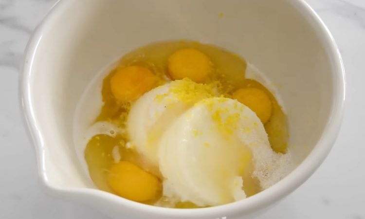 2. В отдельной миске соедините рикотту, яйца и щепотку соли. Добавьте сахар, цедру лимона и лимонный сок. С помощью венчика или миксера перемешайте до однородной кремовой консистенции без комочков. Начинка должна быть гладкой, слегка густой, но не сухой — она должна легко ложиться на тесто и держать форму.