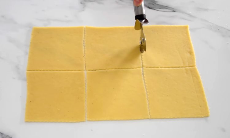 3. Достаньте тесто из холодильника и разделите его на две равные части. На слегка присыпанной мукой поверхности раскатайте каждый кусок в прямоугольник толщиной около 2–3 мм. С помощью ножа или резака вырежьте из теста 12 квадратов одинакового размера.